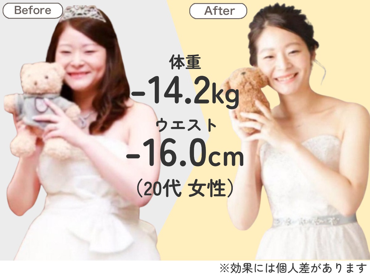 体重:59.8kg → 45.6kg( −14.2kg )、体脂肪:38.0% → 25.6%( −12.4% )、ウエスト:74.0cm → 58.0cm( −16.0cm )
